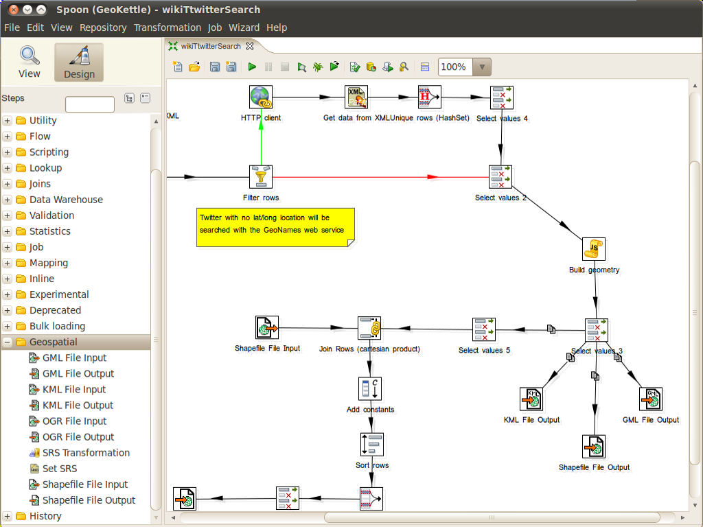 GeoKettle is a “spatially-enabled” version of the Pentaho Data Integration (Kettle). It is a powerful, metadata-driven spatial ETL (Extract, Transform and Load) tool dedicated to the integration of different data sources for building and updating geospatial databases and data warehouses.