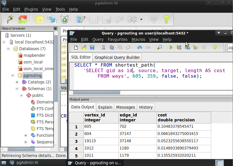 pgRouting extends the PostGIS/PostgreSQL geospatial database to provide geospatial routing functionality.