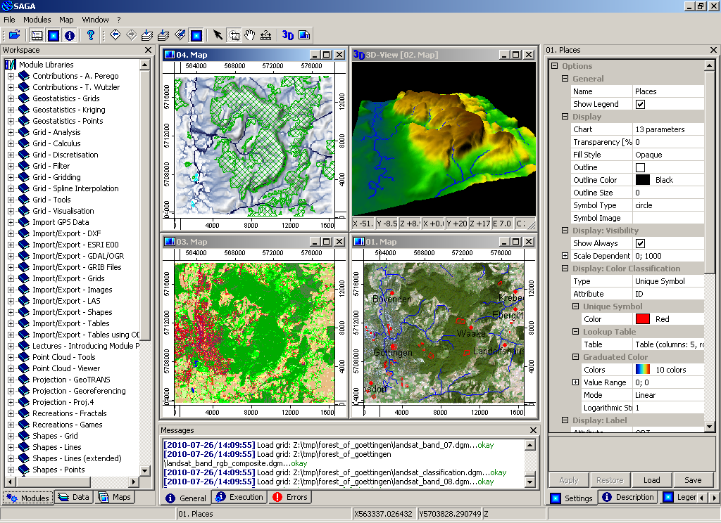 SAGA (System for Automated Geoscientific Analyses) is an open source geographic information system (GIS) used for editing and analysing spatial data. It includes a large number of modules for the analysis of vector (point, line and polygon), table, grid and image data. Among others the package includes modules for geostatistics, image classification, projections, simulation of dynamic processes (hydrology, landscape development) and terrain analysis. The functionality can be accessed through a GUI, the command line or by using the C++ API.