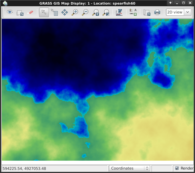 Now add your new raster layer to the layer list as you did before with the elevation raster map, except this time it will be in your “user1” working mapset. You might un-tick the elevation layer check-box now so that the two don’t draw over the top of each other. Click on the eyeball to view your new map. The colors might not be as you’d like so let’s change them. With the fractal DEM selected in the layer list, in the Raster menu select Manage colors ‣ Color Tables. In the “Colors” tab click on the pull-down list for the “Type of color table” option, and pick one from the list. “srtm” is a nice choice. Once done click the [Run] button and close the r.colors dialog window.