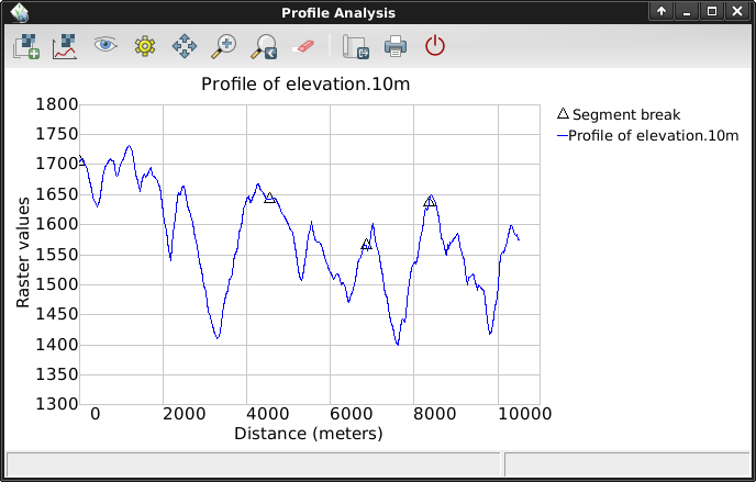 Back in the GIS Layer Manager window click on the elevation raster map name to select it. Then in the Map Display window, to the right of the zooming buttons on the Map Display toolbar is an icon with a line graph and checkerboard on it. Click on that and select Profile Surface Map. If it isn’t automatically listed again pick an elevation map as the raster layer and press [Ok]. The second button in from the left allows you to set out the profile line, click it then mark out a few points on the Map Display canvas. When done go back to the Profile window and click on the eyeball button to create the plot. Click on the I/O button of the far right to close the profile window.