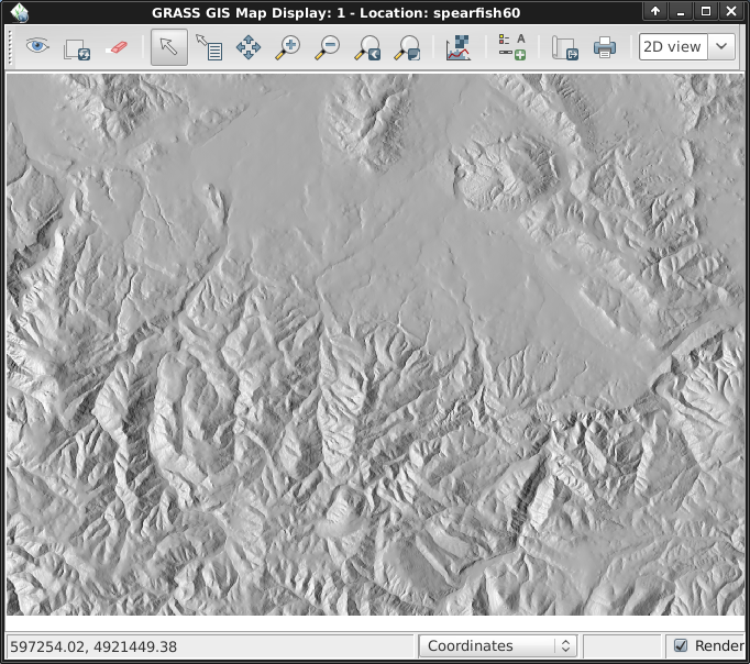 Next we’ll create a shaded relief map of the elevation layer we saw earlier. Start by verifying that the computational region is set match the raster map of interest, “elevation” in the PERMANENT mapset. To do this, make sure it is loaded into the layer list of the main Layer Manager window, right click on its name and select “Set computation region from selected map(s)”. In the Raster menu select Terrain analysis ‣ Shaded relief (Terrain analysis is about half way down), and the module control dialog will appear. With the elevation map name selected as the input map click [Run]. Now add the new elevation.shade @user1 map into your layer list and un-tick the other raster layers, then click the eyeball to re-render. (If you get sick of clicking the eyeball all the time you can tick the “Render” box in the bottom right of the Map Display window to have that happen automatically)