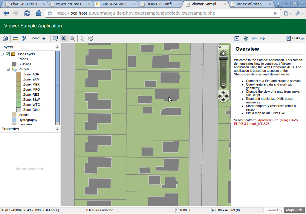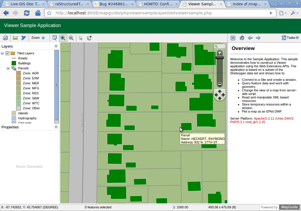 - to preview the change, open a browser to address http://localhost:8008/mapguide/phpviewersample/ajaxtiledviewersample.php or click the Preview icon in the tool bar from Maestro main GUI), which will open a browser to the above address. In the browser map view, Zoom in to building level, the building color now is Green.