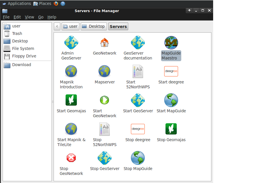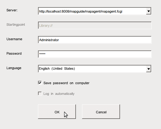 - To start Maestro, go to Desktop->Server, click icon MapGuide Maestro, this will open Maestro login GUI, as shown in following screenshot. Login to http://localhost:8008/mapguide/mapagent/mapagent.fcgi with username “Administrator” and password “admin”