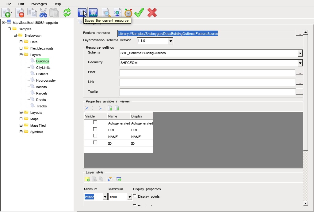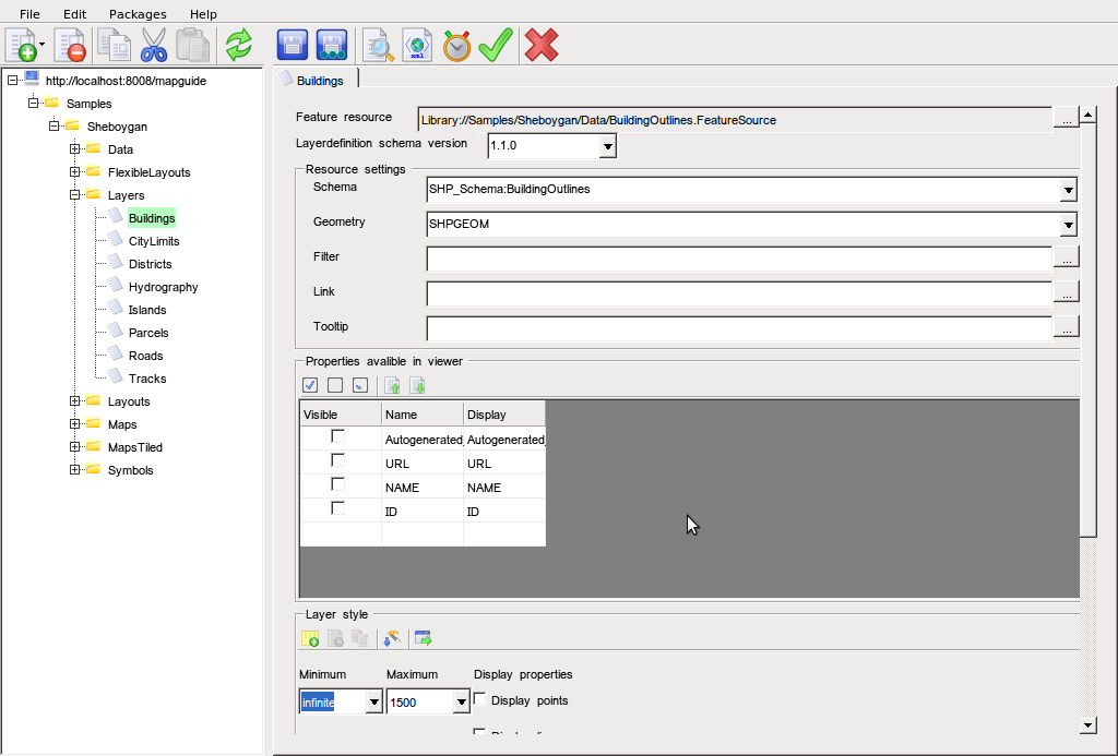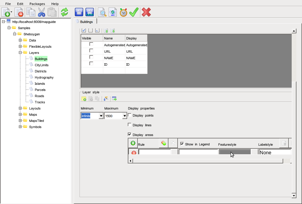 - Expand tree view on left panel, go to Samples->Sheboygan->Layers, double click Buildings, the layer editor for Buildings will open in the right panel, as shown in the following screenshot: