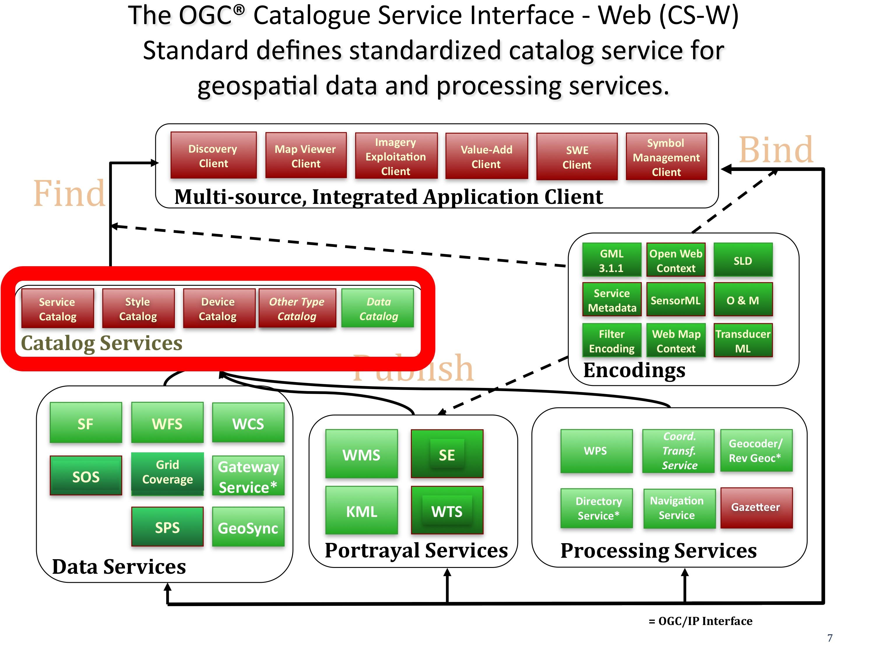 The OGC Catalogue Service interface standard specifies a design pattern for defining interfaces to publish and search collections of descriptive information (metadata) about geospatial data, services and related information objects. Providers of resources, such as content providers, use catalogues to register metadata that conform to the provider’s choice of an information model; such models include descriptions of spatial references and thematic information. Client applications can then search for geospatial data and services in very efficient ways.