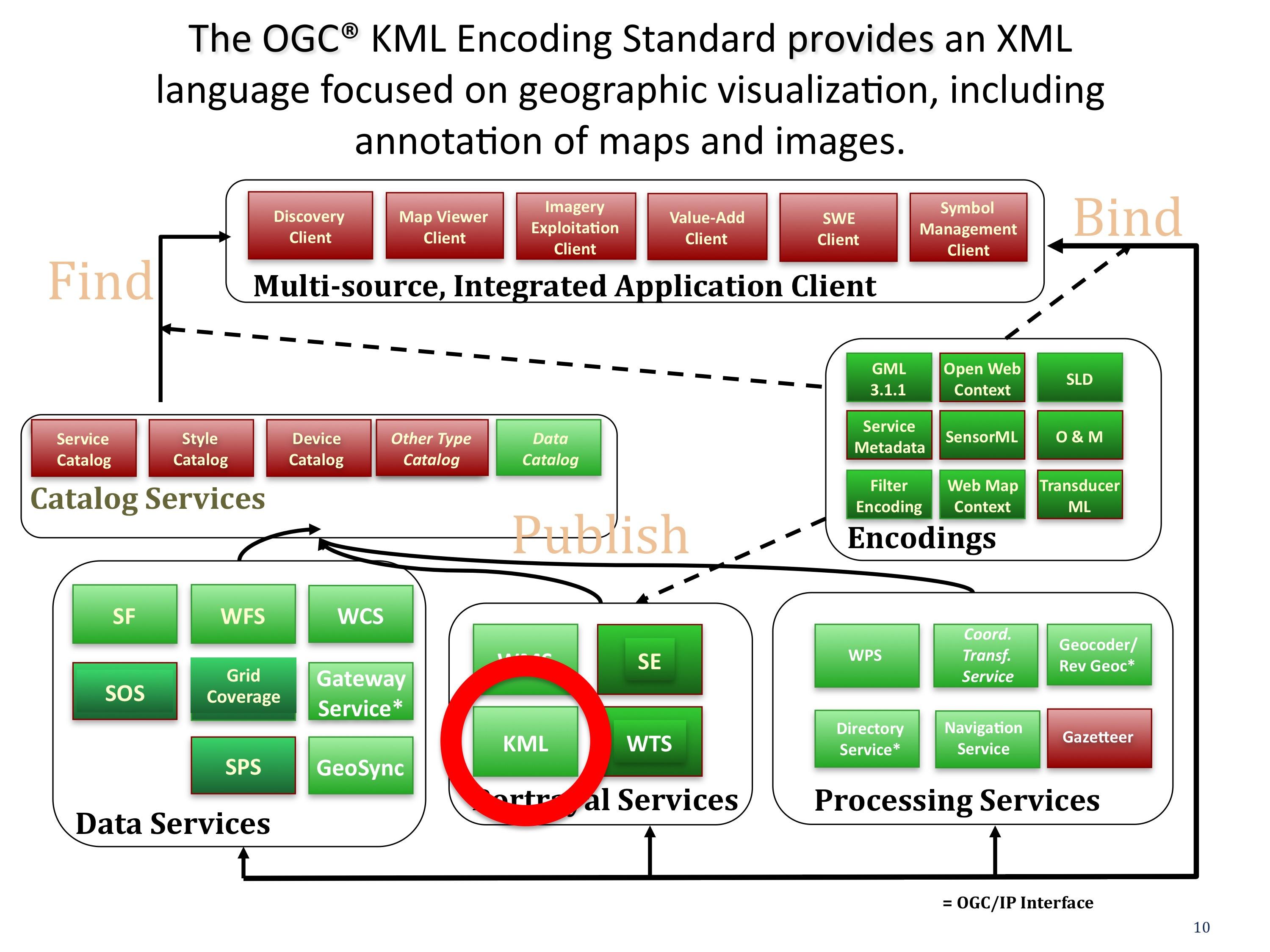 KML is complementary to most of the existing OGC specifications including key standards such as GML (Geography Markup Language), WFS (Web Feature Service) and WMS (Web Map Service). Currently, KML (v2.1) utilizes certain geometry elements derived from GML (version 2.1.2). These elements include point, line-string, linear-ring, and polygon.