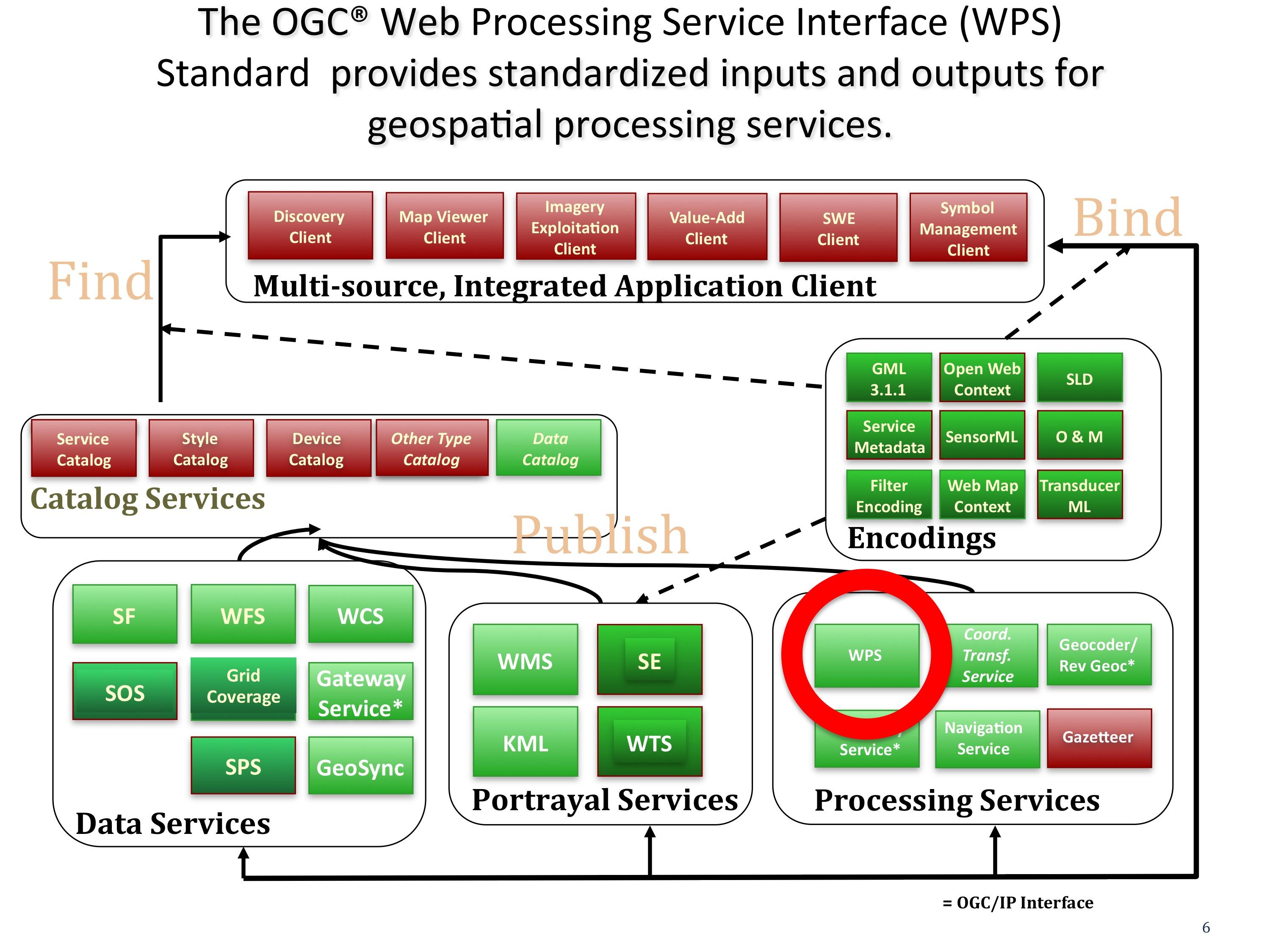 The OGC® Web Processing Service (WPS) Standard describes how to access geospatial processes from a web interface. Processes include any algorithm, calculation or model that operates on spatially referenced vector or raster data. A WPS may offer calculations as simple as subtracting one set of spatially referenced numbers from another (e.g., determining the difference in influenza cases between two different seasons), or as complicated as a global climate change model. (http://www.opengeospatial.org/standards/wps)