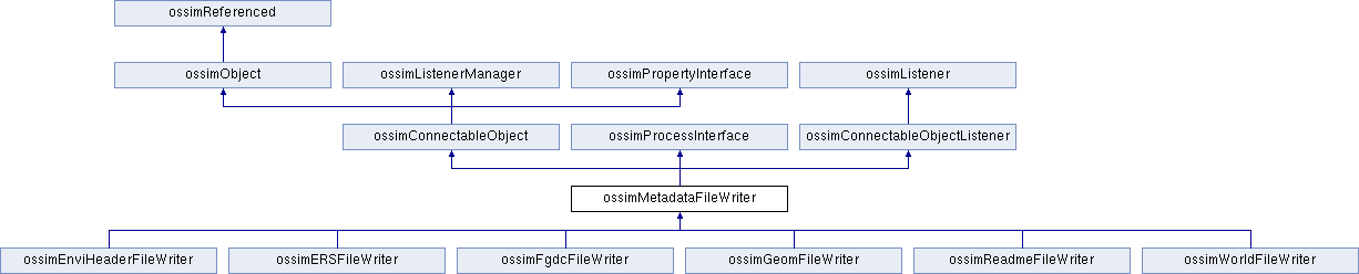 Implemented in ossimFgdcFileWriter, ossimWorldFileWriter, ossimEnviHeaderFileWriter, ossimERSFileWriter, ossimGeomFileWriter, and ossimReadmeFileWriter.